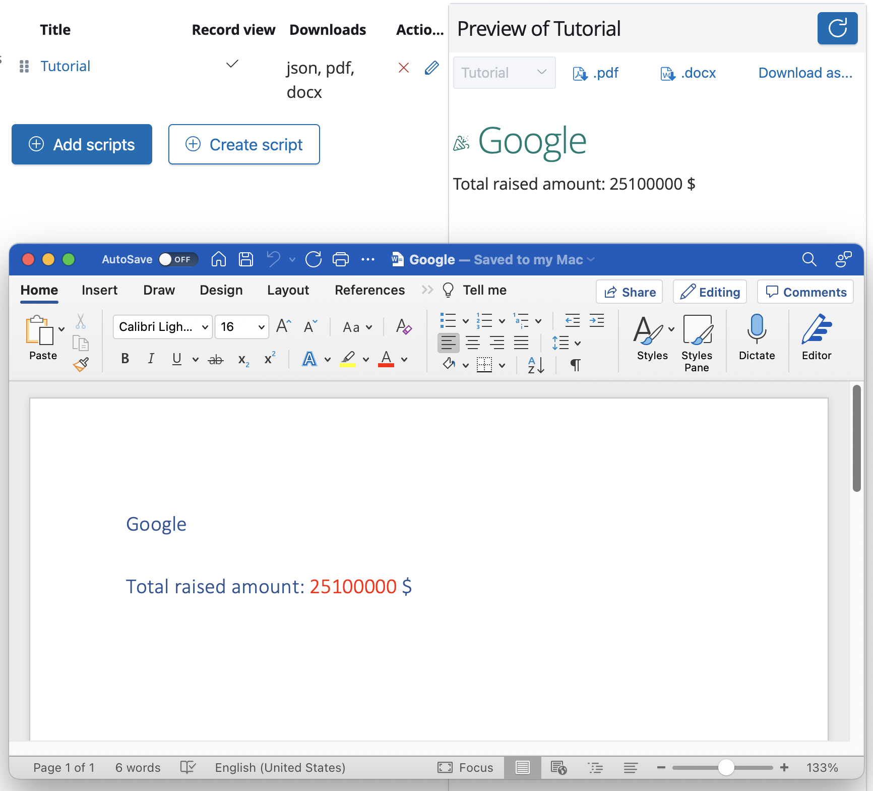 5. You should now see the button to download a docx file when previewing a record. Click on it and you should get a Word file named after the company with the contents from the template created previously in jsreport.